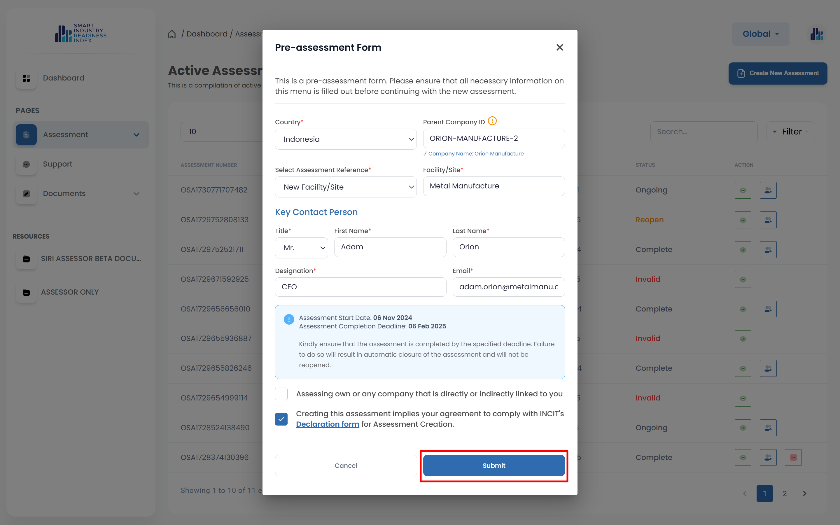 After that, click on the 'Submit' button to start your assessment to the company. Or click on the 'Cancel' button to cancel creating a new assessment.