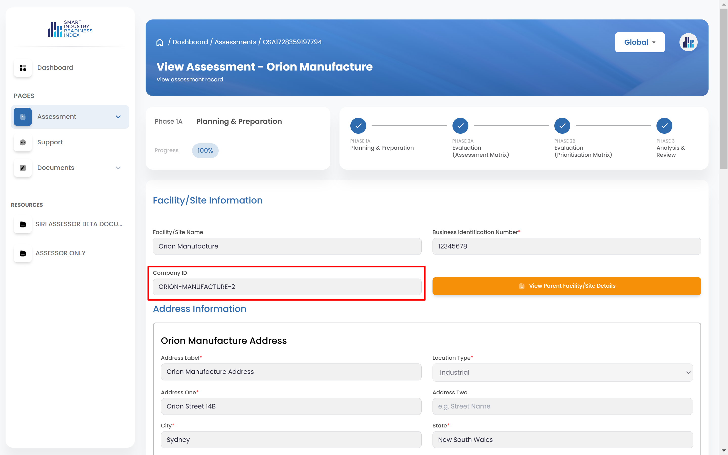 To see the parent company ID from the previous assessment, go to your previous assessment and click on the Phase 1A – Planning and Preparation. The parent reference ID will be in the Company ID field under Facility/Site Information section.