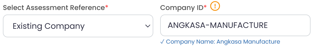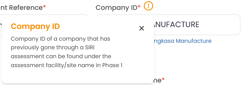- If you choose an Existing Company in the ‘Assessment Reference’ field, input the existing company ID in the ‘Company ID’ field. This is a mandatory field. Company ID is a unique identifier assigned to the related company which has previously undergone a SIRI assessment. All assessments with the same Company ID will be consolidated under this identifier. You can get the company ID from the previous assessment you conducted.