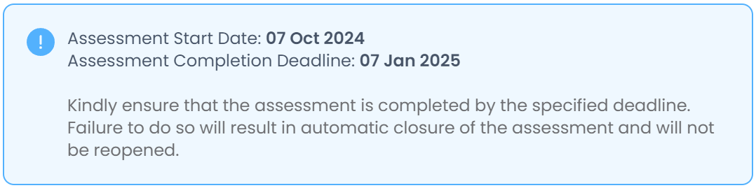- A warning message will appear to remind you to complete the assessment by the deadline set by the system. This is to ensure that you are able to complete the assessment within the given timeframe.