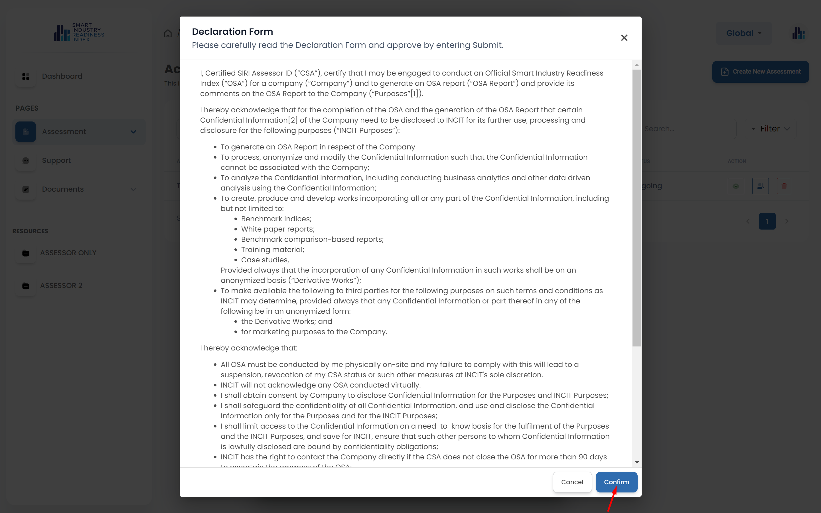 When you tick this checkbox, a new pop-up will appear to display the declaration form. Click on the 'Confirm' button to approve the declaration form. This is a mandatory field.
