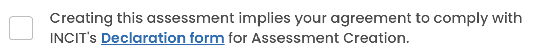 - Tick on the 'Declaration form' checkbox to imply your agreement to comply with INCIT declaration form for assessment creation.