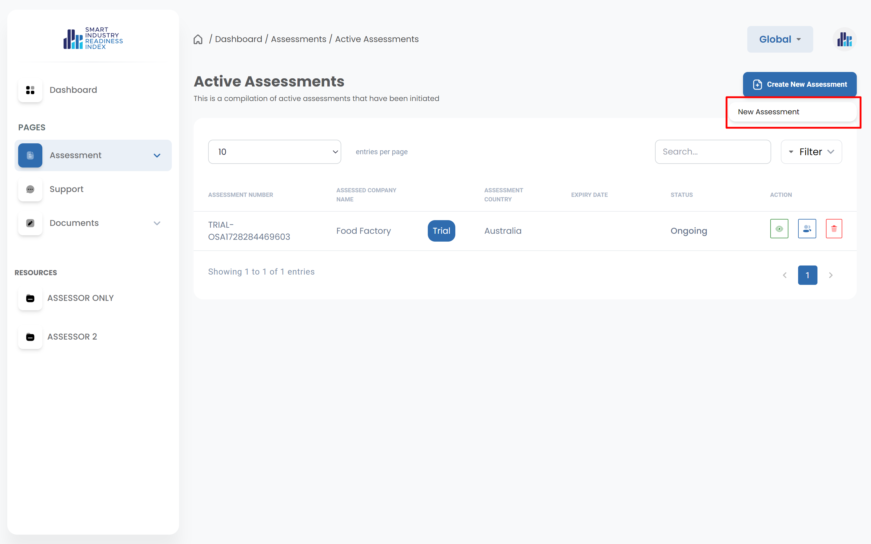 To create a new assessment, under the Active Assessment or Draft Assessment menu click on the 'Create New Assessment' button located at the top right side of the page and select 'New Assessment'.