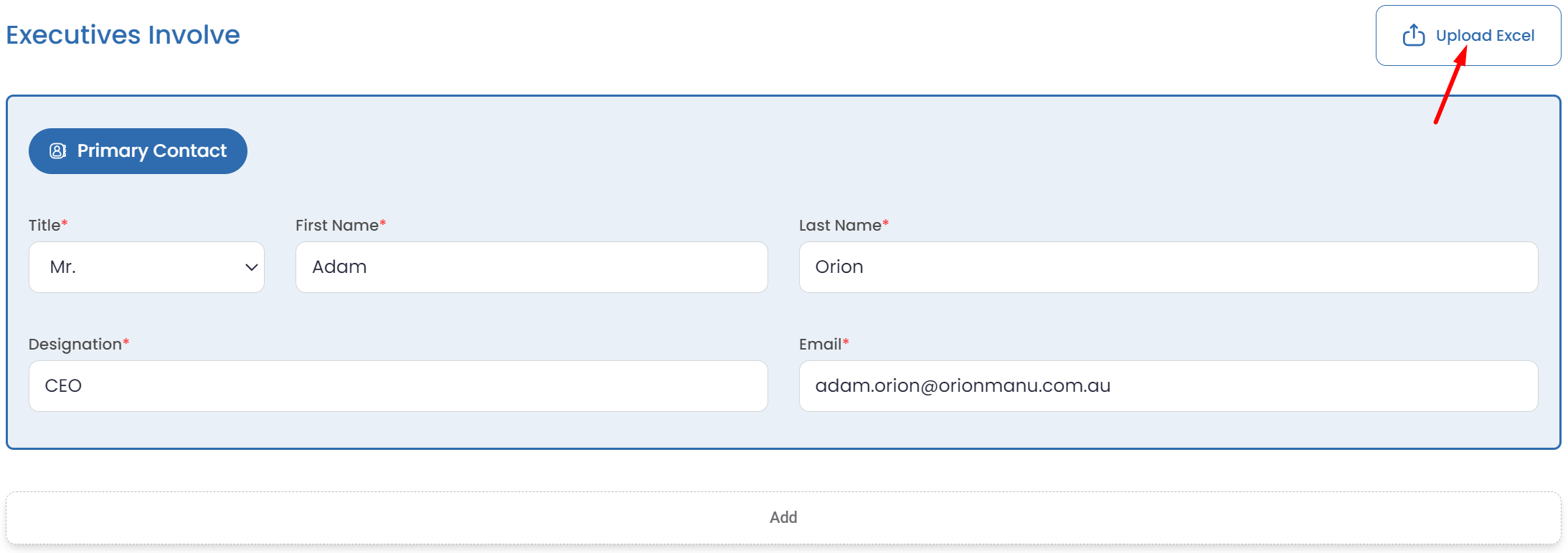 - You can also upload an Excel file to fill out the executive/contact information by clicking on the 'Upload Excel' file.