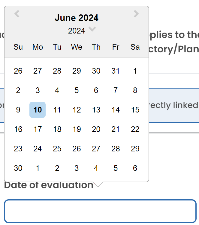 - Select the date of evaluation when the assessment will be conducted in the 'Date of Evaluation' field. This is a mandatory field.