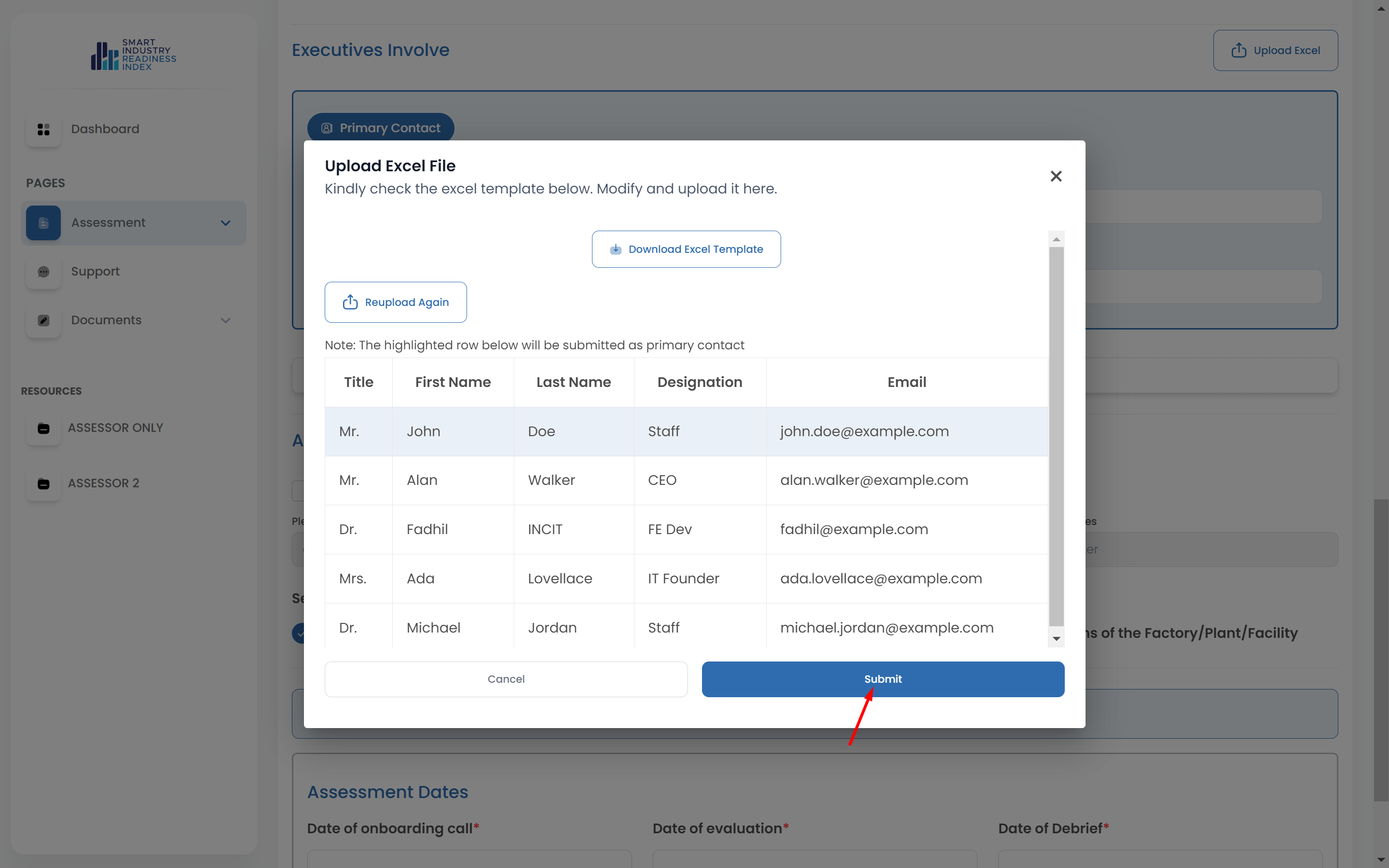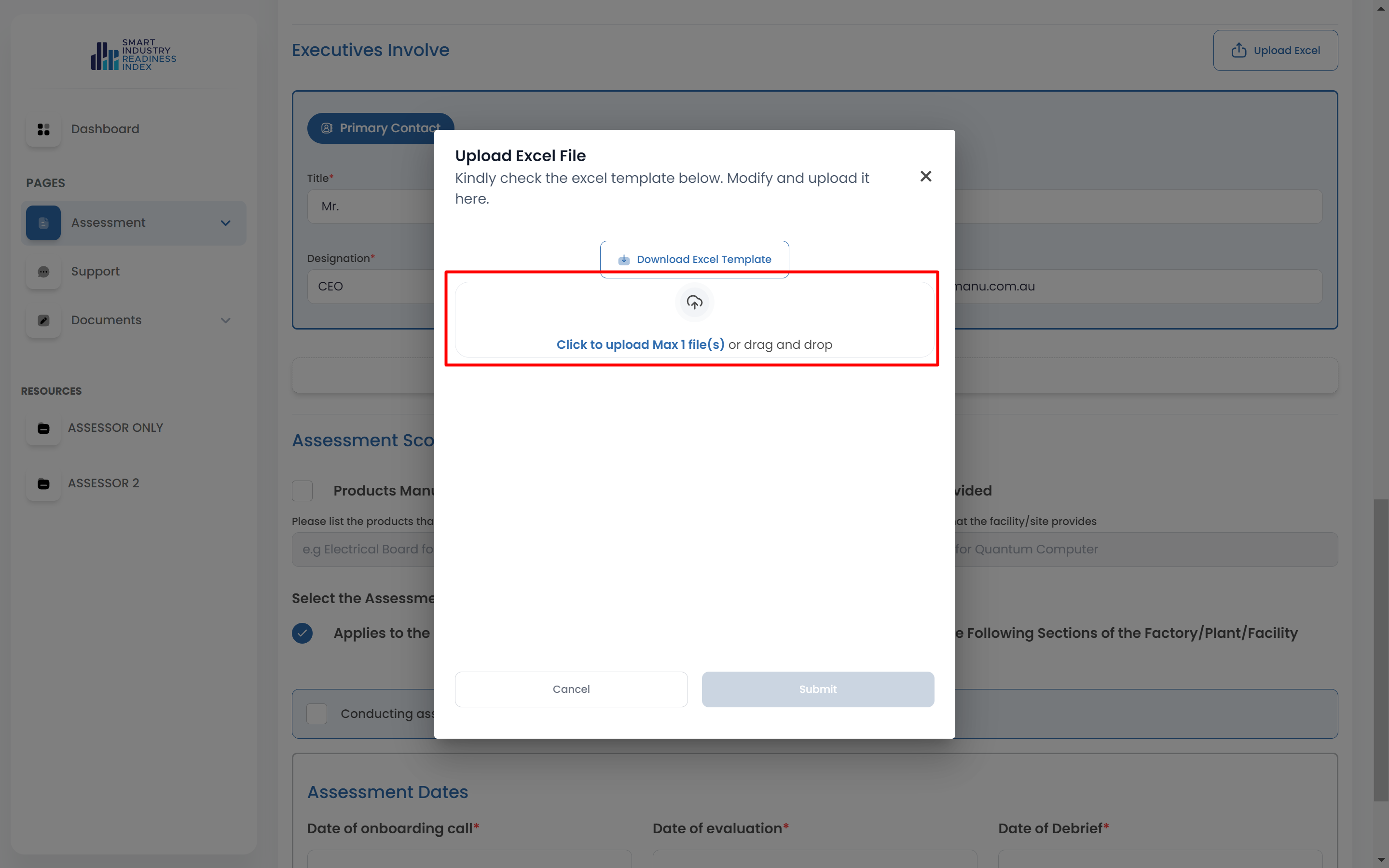 Or you can download the excel template that has been provided by clicking on the 'Download Excel Template'. You can edit the template with the executive/contact from the facility/site that you are assessing.