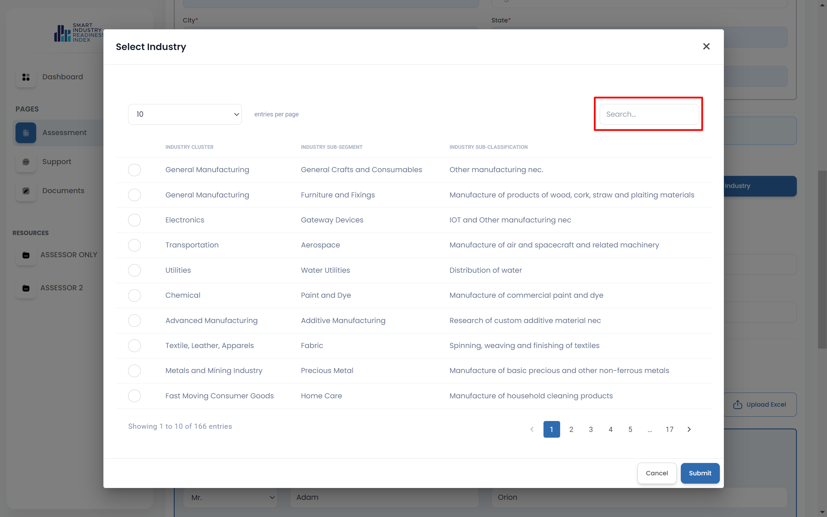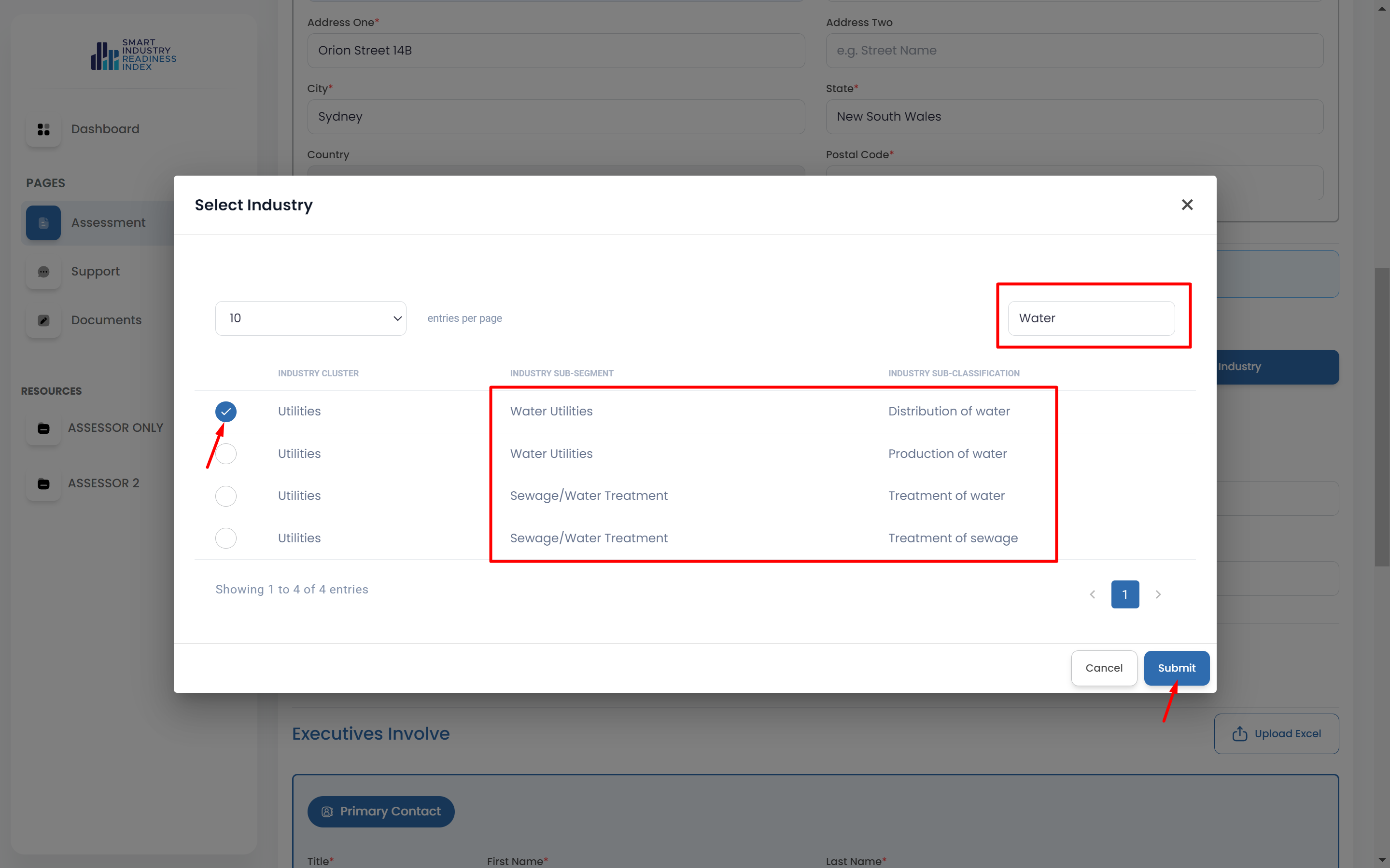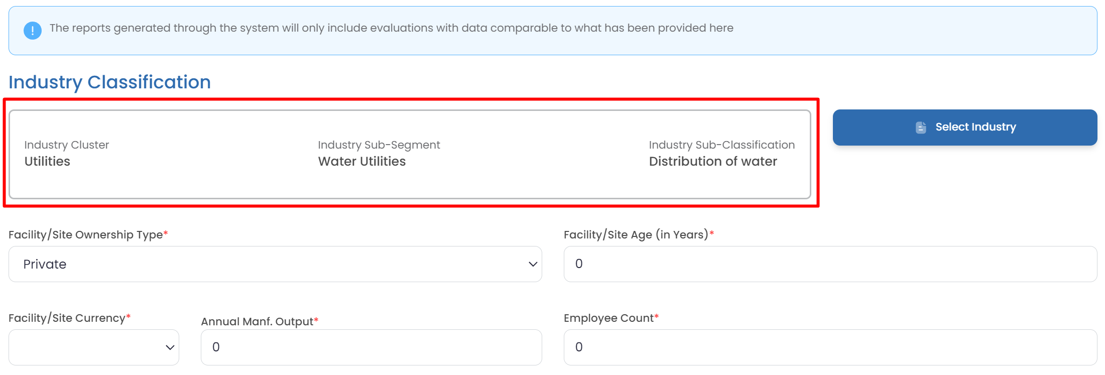 Select and input the industry classification of the facility/site you are assessing in the Industry Classification section.