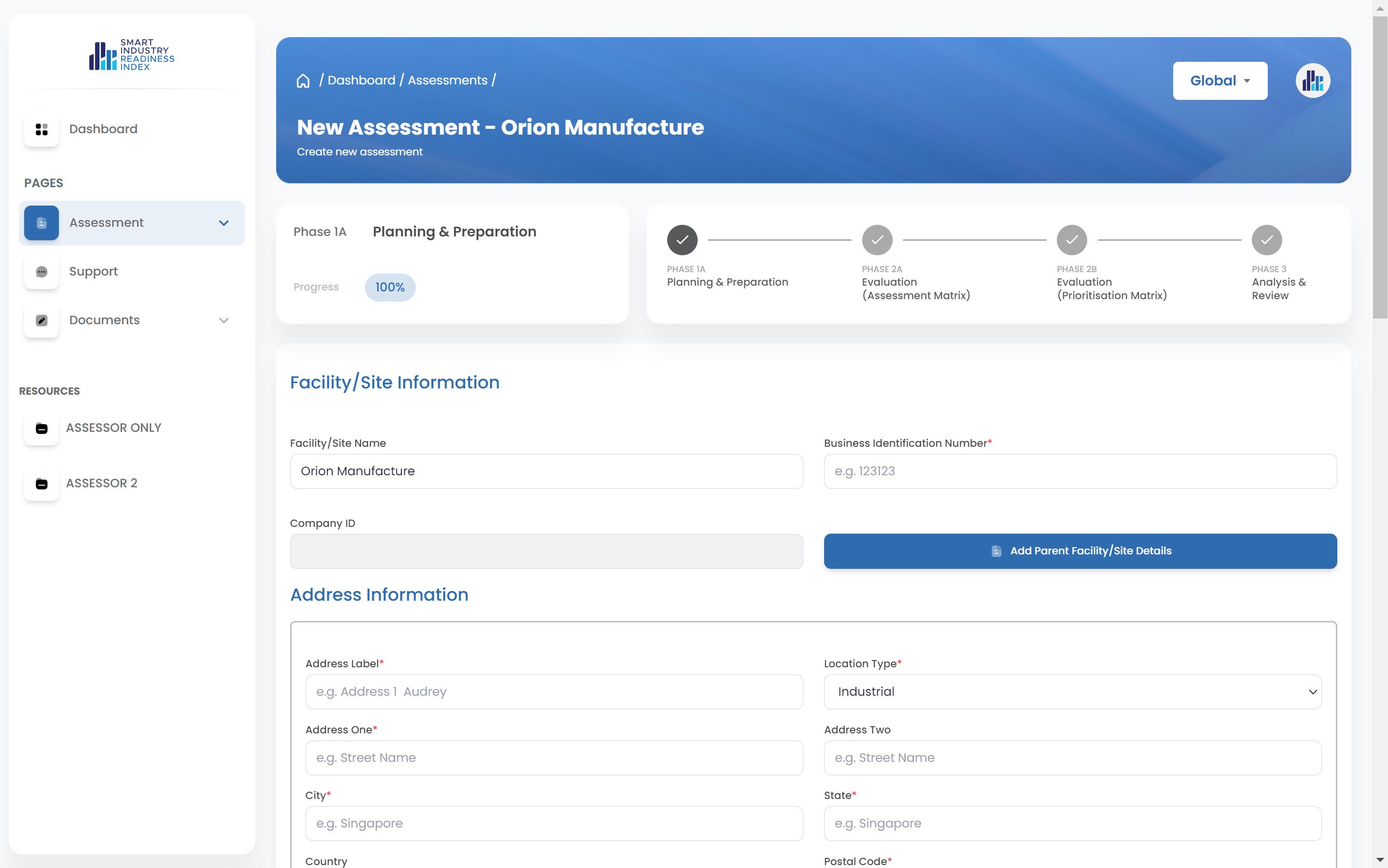 - The ‘Company ID’ field is currently empty and disabled for editing. Once you save the data or proceed to the next phase, SIRI will generate a company ID. You can then use the company ID as the Parent Reference ID or Company Reference ID in the Pre-assessment form for your next assessment.