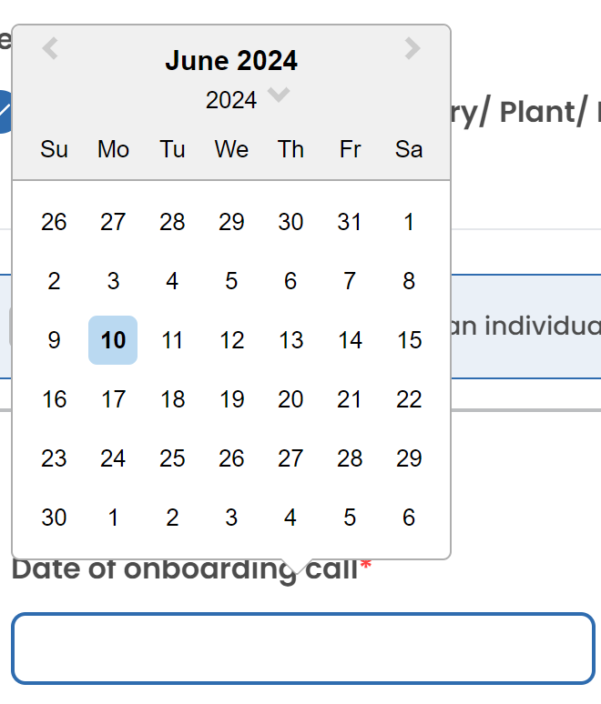 - Select the assessment date of the onboarding calls in the 'Date of Onboarding Call' field. This is a mandatory field.