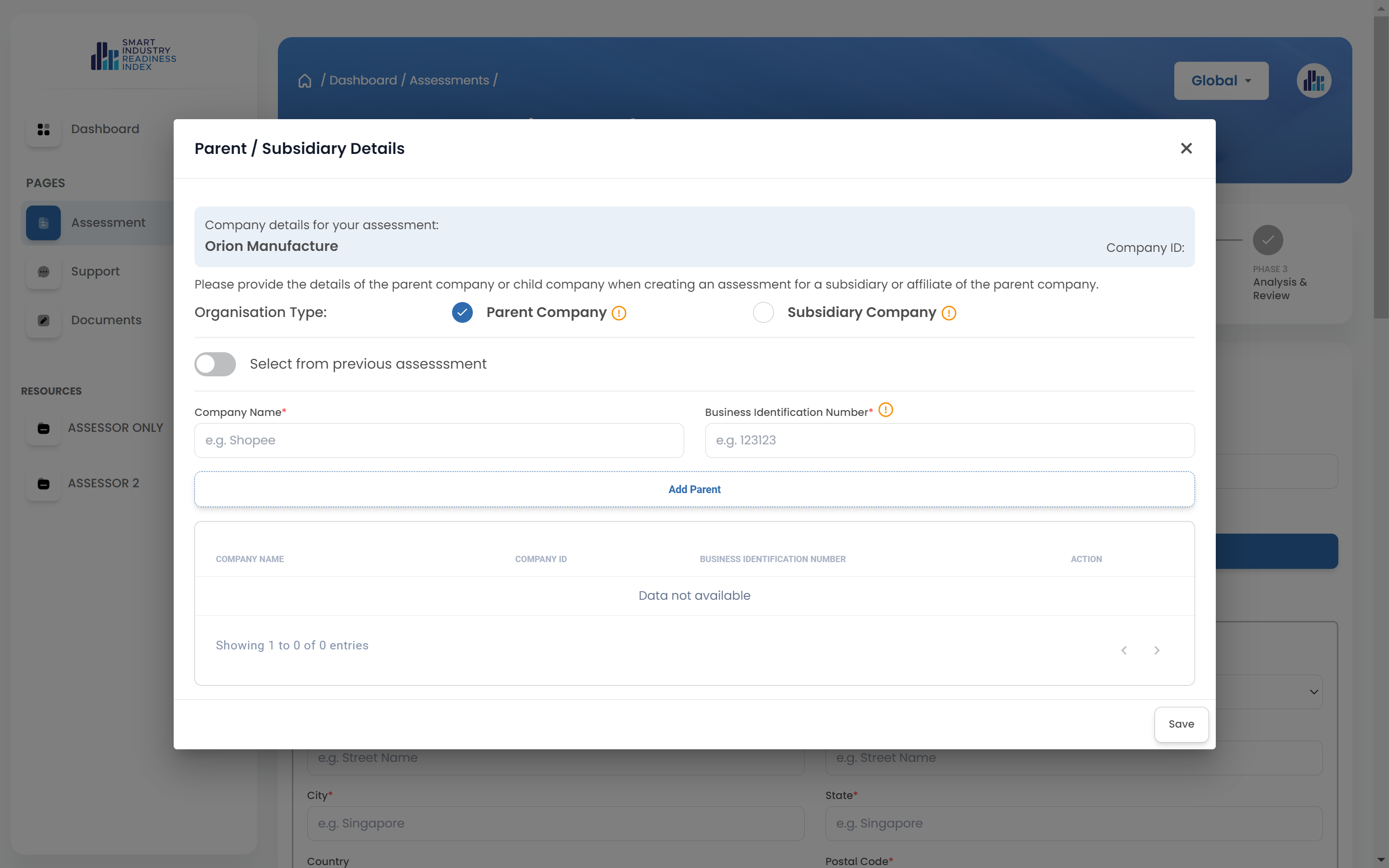 If the parent/subsidiary company is not in your previous assessment, you can add the company name in the 'Company Name' field. Add the parent/subsidiary business identification number in the 'Business Identification Number' field. Both fields are mandatory.