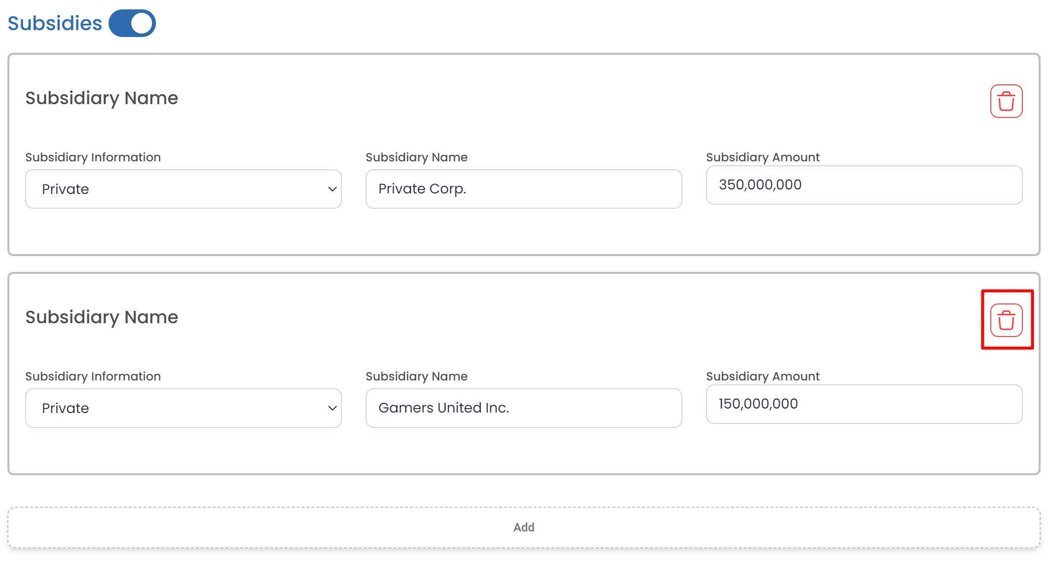 Click on the 'Add' button to add a subsidy. A new section will appear. You can also add more than one subsidy.