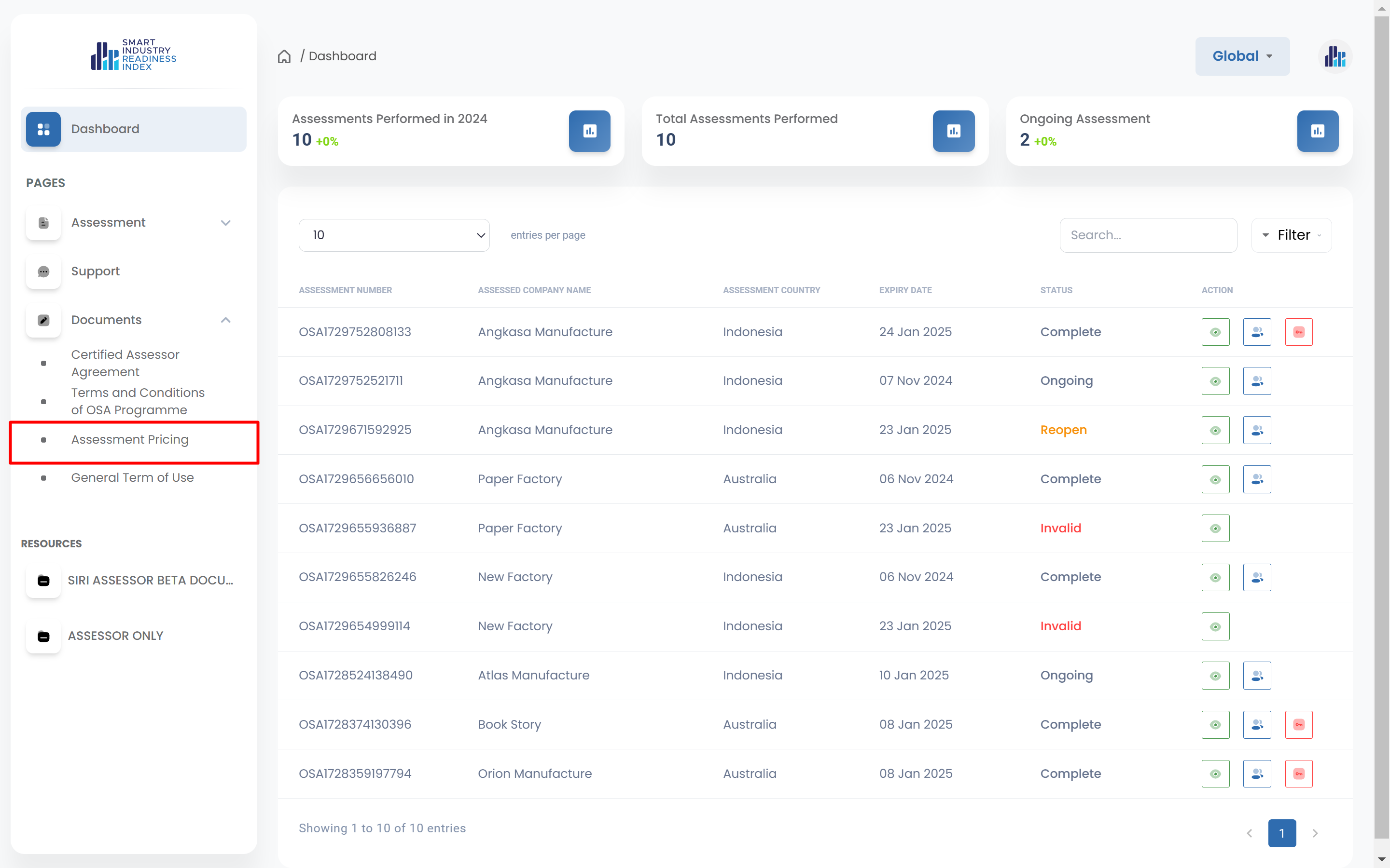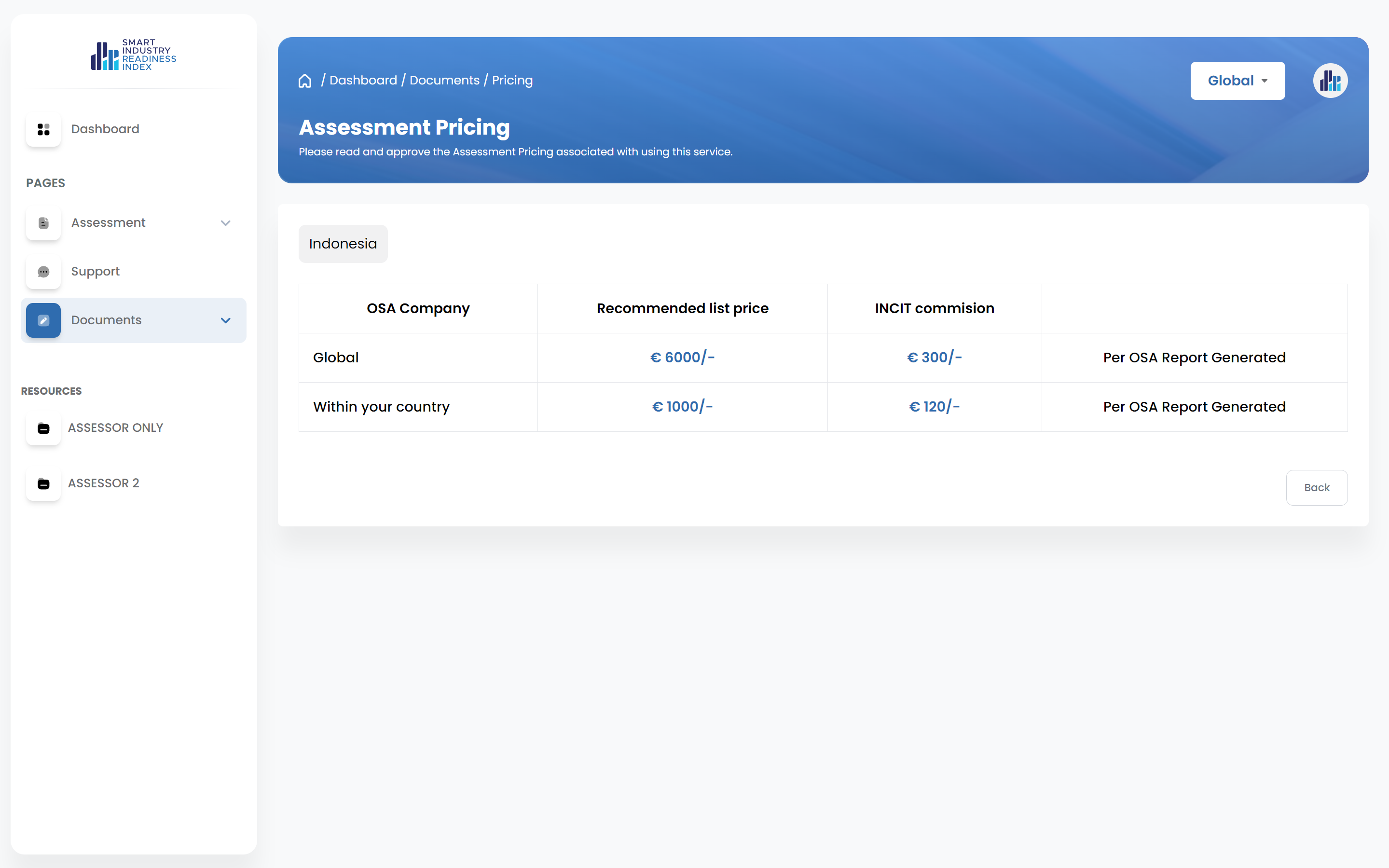 To view Assessment Pricing document, click on the 'Assessment Pricing' menu at the left sidebar.