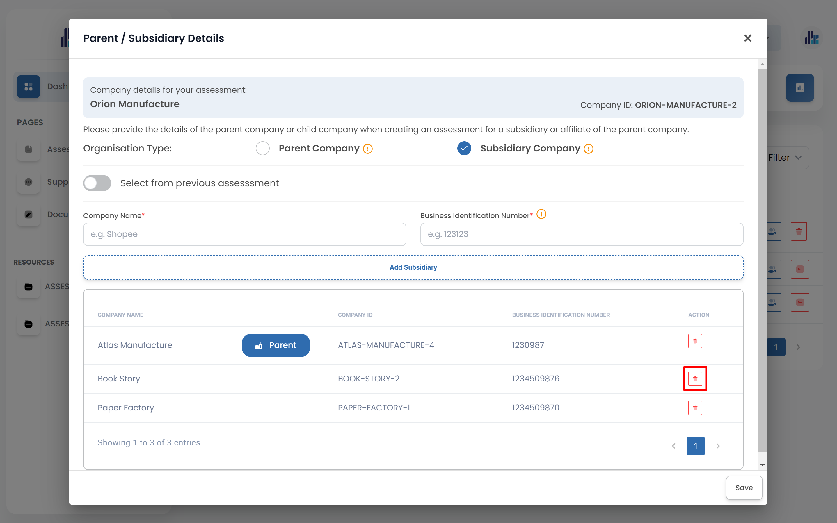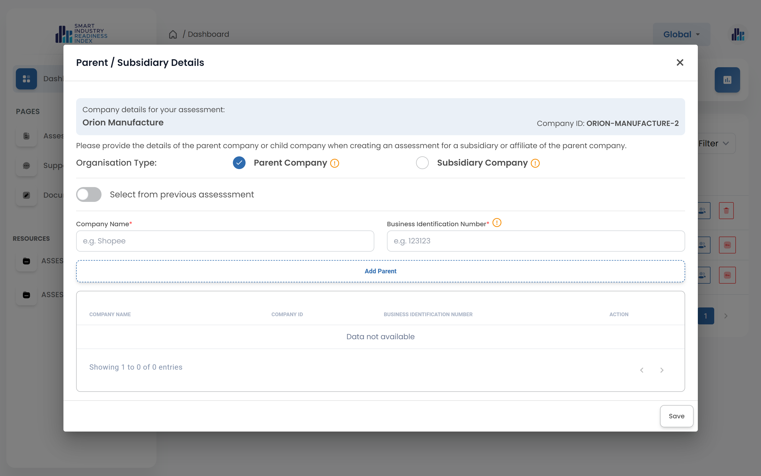 - You can select the parent company/subsidiary company from your previous assessment by switching the 'Select from previous assessment' toggle.