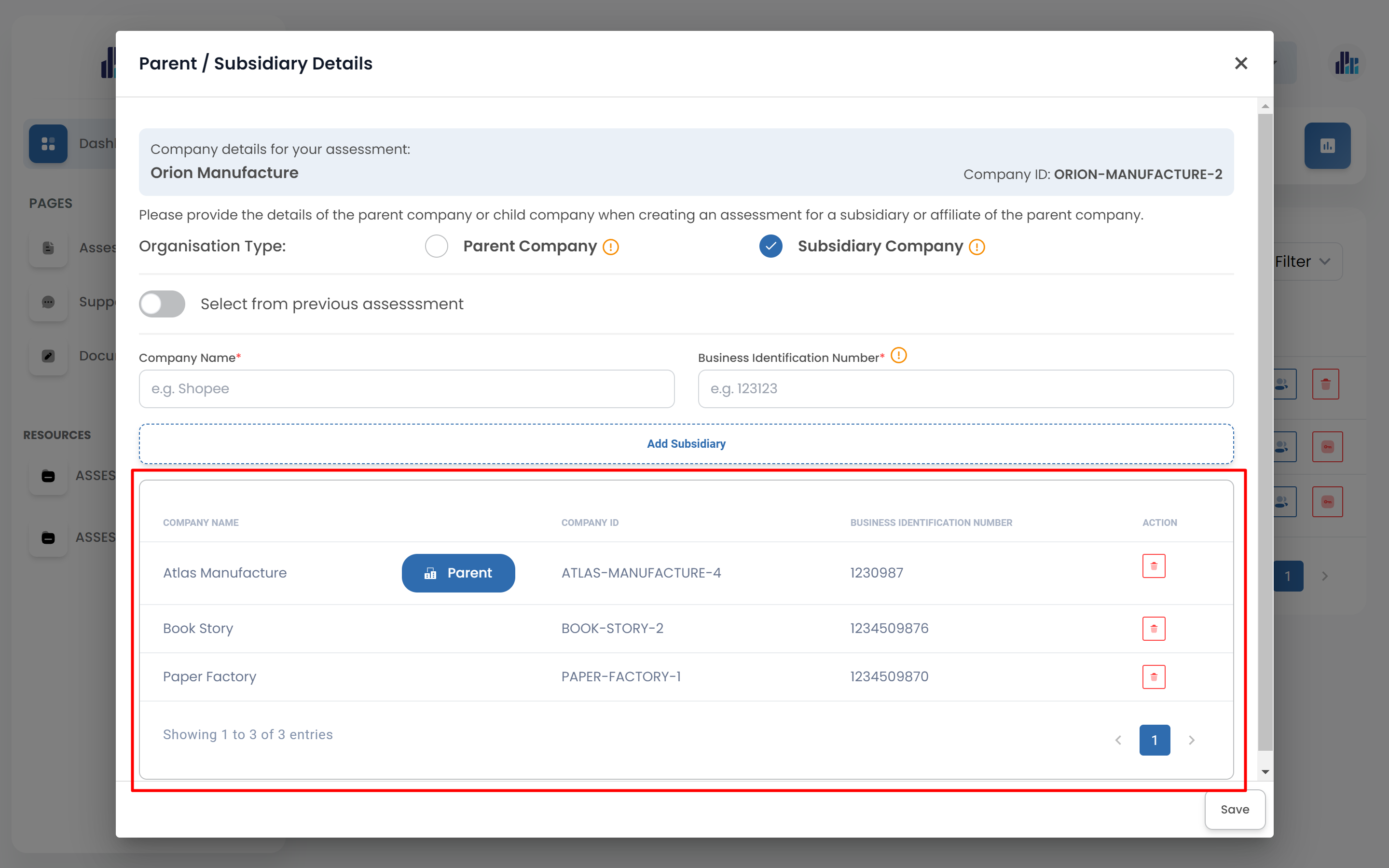- If the parent/subsidiary company is not in your previous assessment, you can add the company name in the 'Company Name' field. Add the parent/subsidiary business identification number in the 'Business Identification Number' field. Both fields are mandatory.