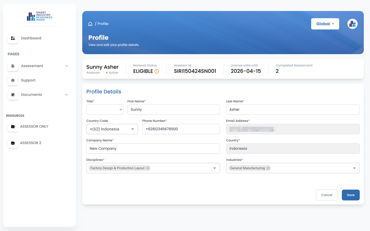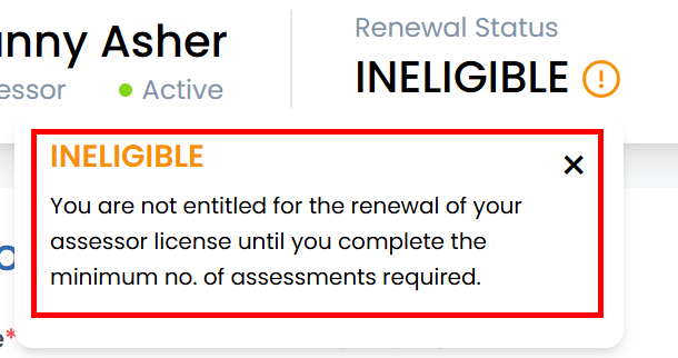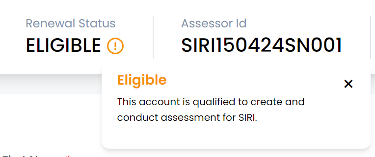 - The next section provides information about your renewal status. If your renewal status is 'Eligible', it means your account qualifies to create and conduct assessments for SIRI. If your renewal status is 'Ineligible', it indicates that you are not eligible for the renewal of your assessor license until you complete the minimum number of required assessments.