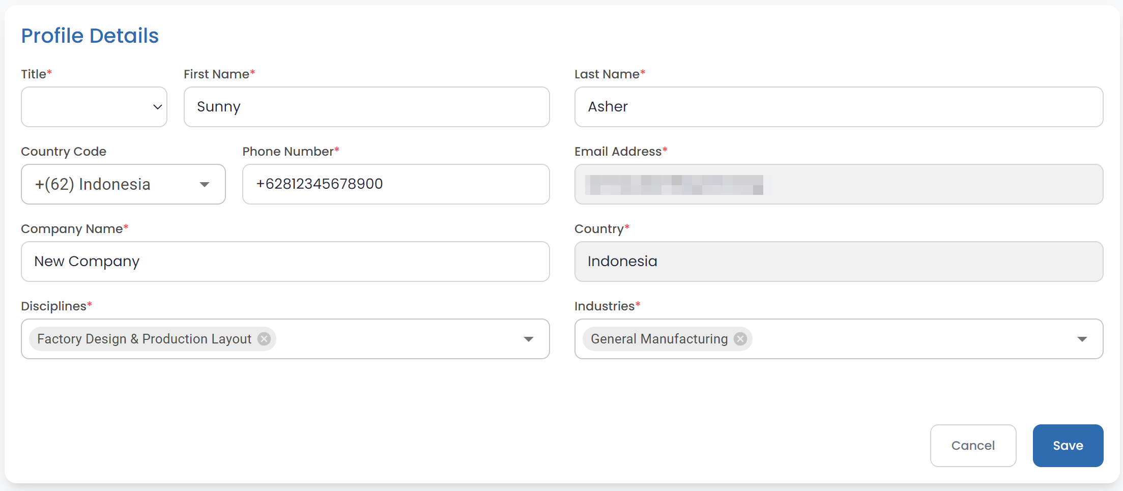 After finishing the editing of your profile, click on the 'Save' button at the bottom of the page to save the updated profile. Alternatively, you can click on the 'Cancel' button to cancel updating your profile.