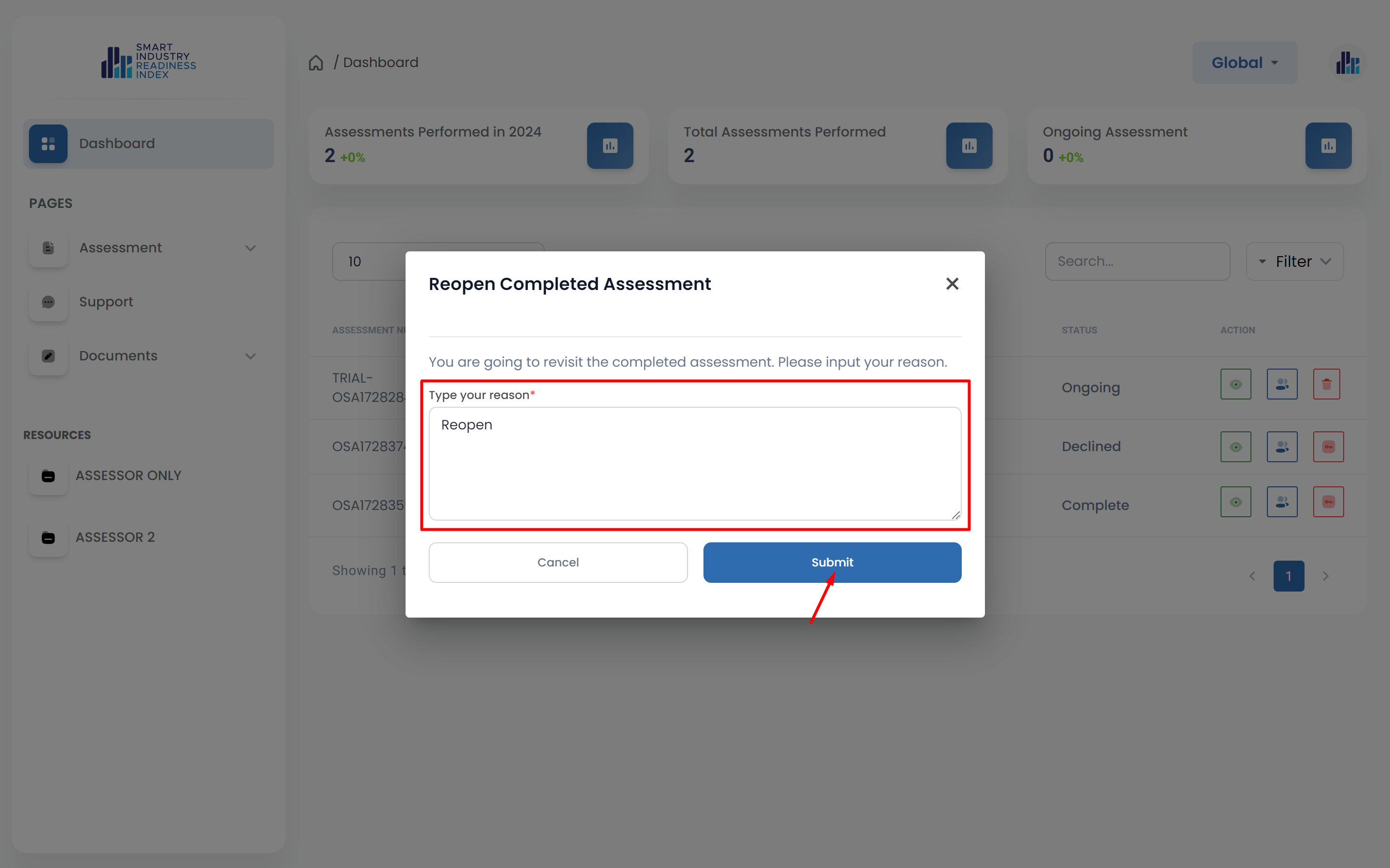 Then a pop-up window will appear. Input your reason to reopen the assessment in the ‘Reason’ field. This is a mandatory field. Then click on the ‘Submit’ button to confirm reopening of the assessment.