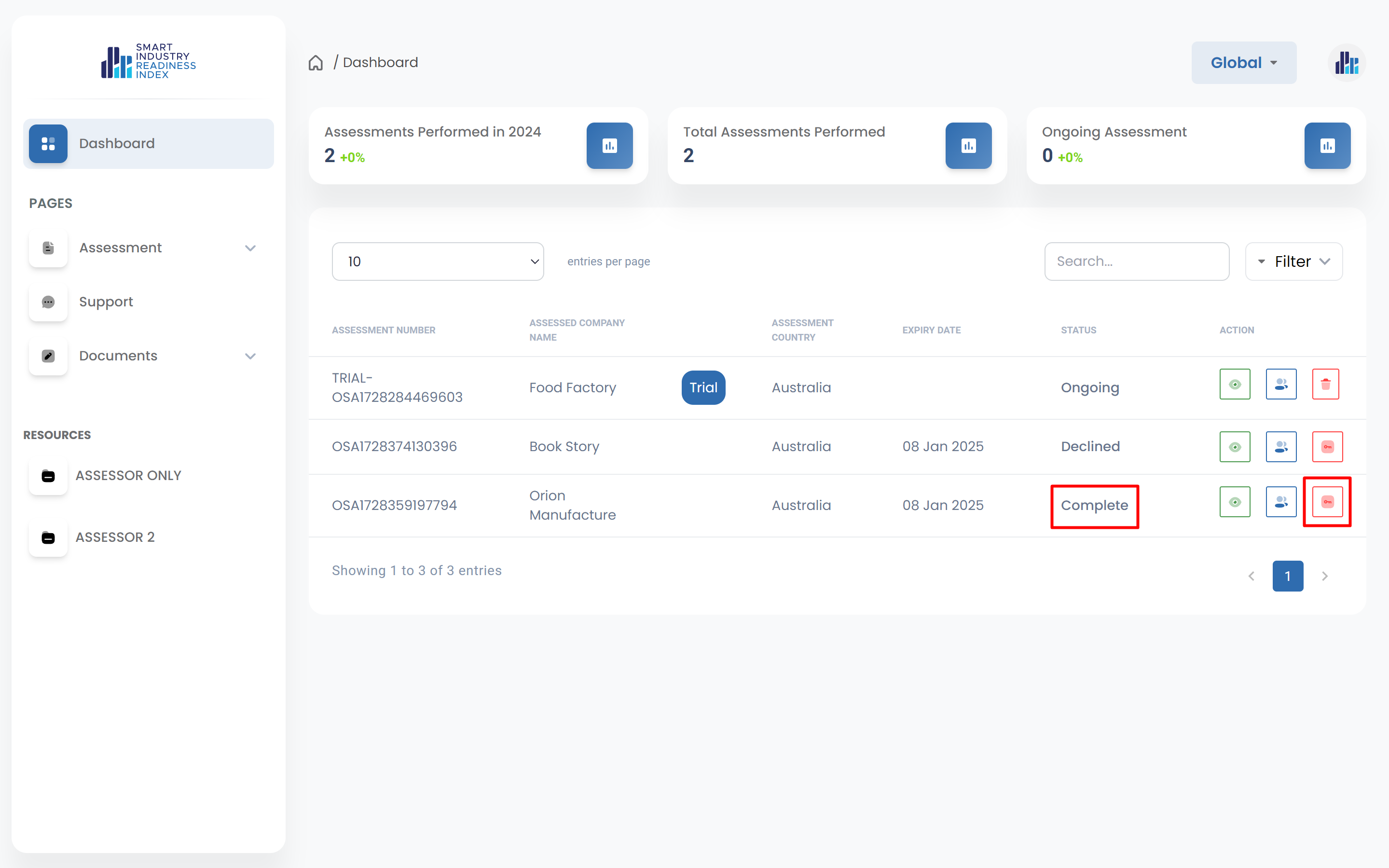 - Complete Assessment: When you finish the reopen assessment, the status of the previous assessment would change to Invalid. If you failed to complete the assessment, the reopen assessment will be deleted, and SIRI will use the previous assessment status. You can reopen a completed assessment twice, but a valid reason is required for each request.