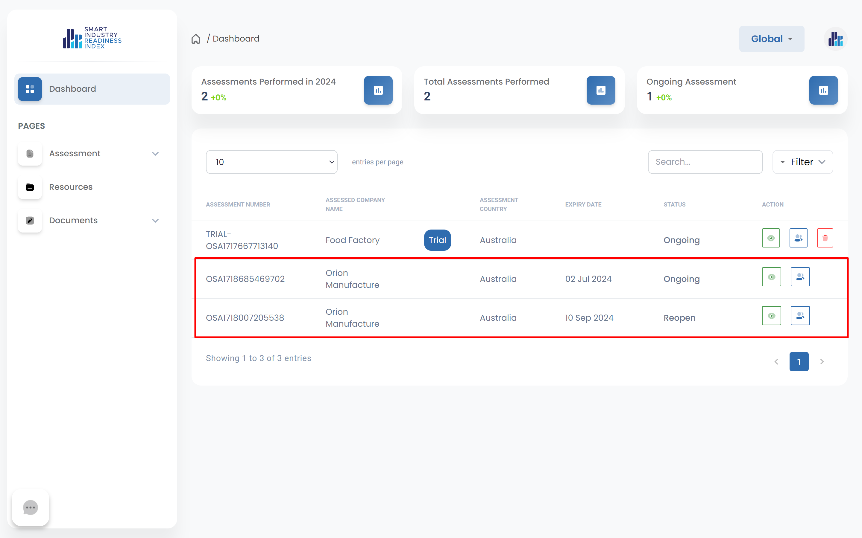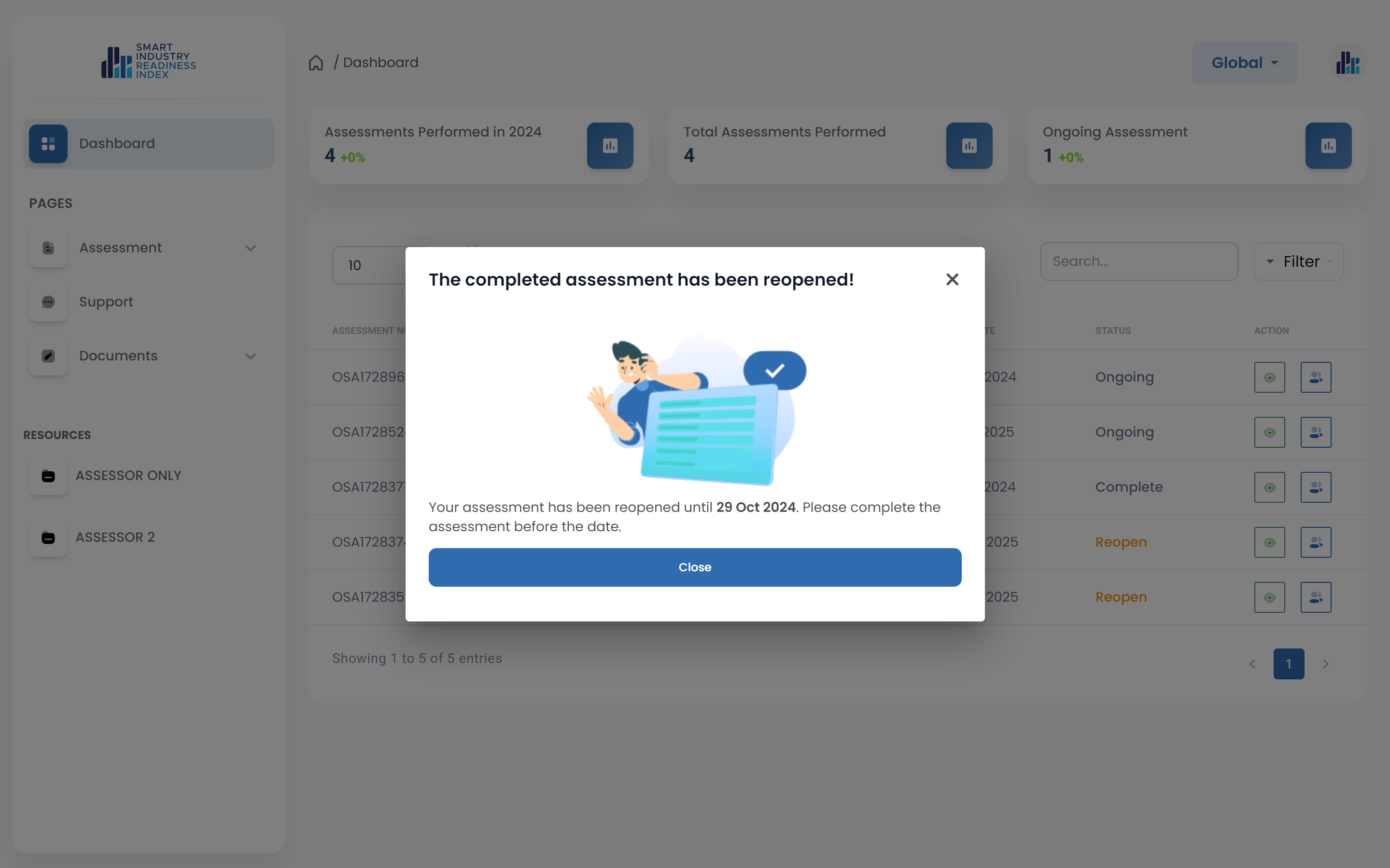 In the Assessment table, you will find that the assessment's status changes to Reopen, and the reopened assessment will appear with an Ongoing status.