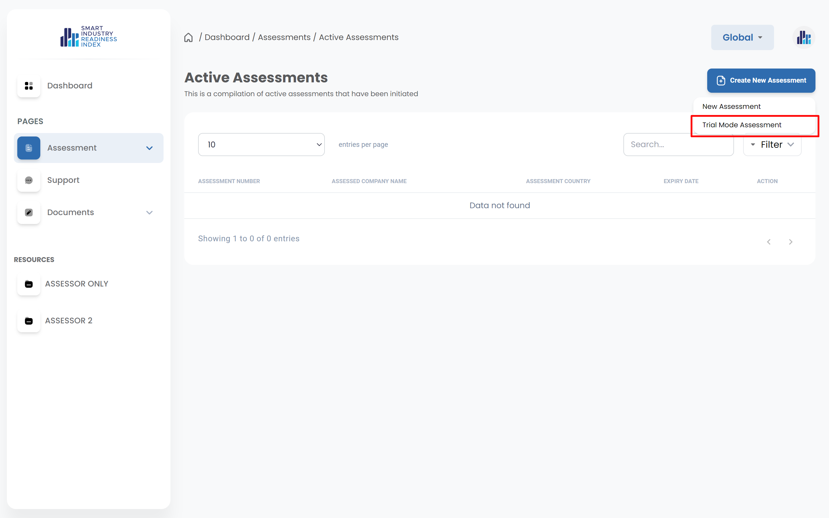 Next, click on the 'Create New Assessment' button at the right top of the page and choose 'Trial Mode Assessment'.